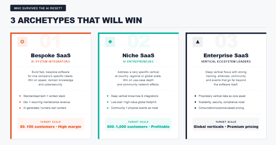 Vertical SaaS with proprietary data, mission-critical workflows, and community will not only survive — it will grow. The vertical software market is projected to expand from ~$134B in 2025 to $194B by 2029. The companies that understood their core product was the knowledge, trust, and data inside the software — not the software itself — will emerge from this reset stronger.
